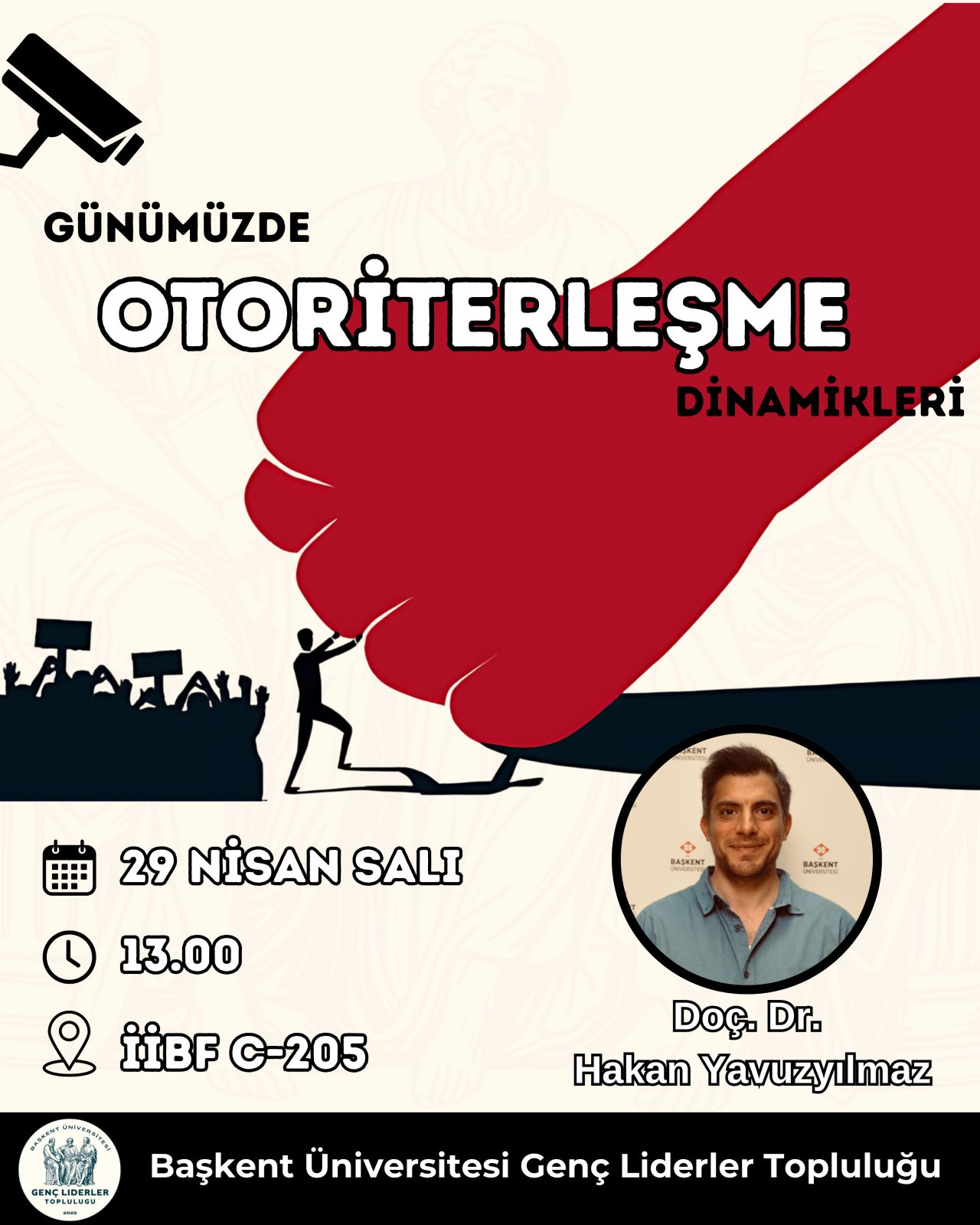 Prof. Dr. Menderes Çınar’ın danışmanlığında ve bölüm öğrencilerimizin yönetiminde bulunduğu Genç Liderler Topluluğu, 29 Nisan Salı günü saat 13.00'te İİBF C-205 No’lu sınıfta Doç. Dr. Hakan Yavuzyılmaz'ın katılımıyla "Günümüzde Otoriterleşme Dinamikleri" başlıklı bir etkinlik düzenleyecektir. "Günümüzde Otoriterleşme Dinamikleri" konulu etkinlikte, günümüzde otoriterleşme eğilimlerinin artışına neden olan toplumsal ve siyasal dinamikler tartışılacaktır. Katılımcılar günümüzün en önemli toplumsal-siyasal meselelerinden biri olan otoriterleşme hakkında yeni bakış açıları geliştireceklerdir.